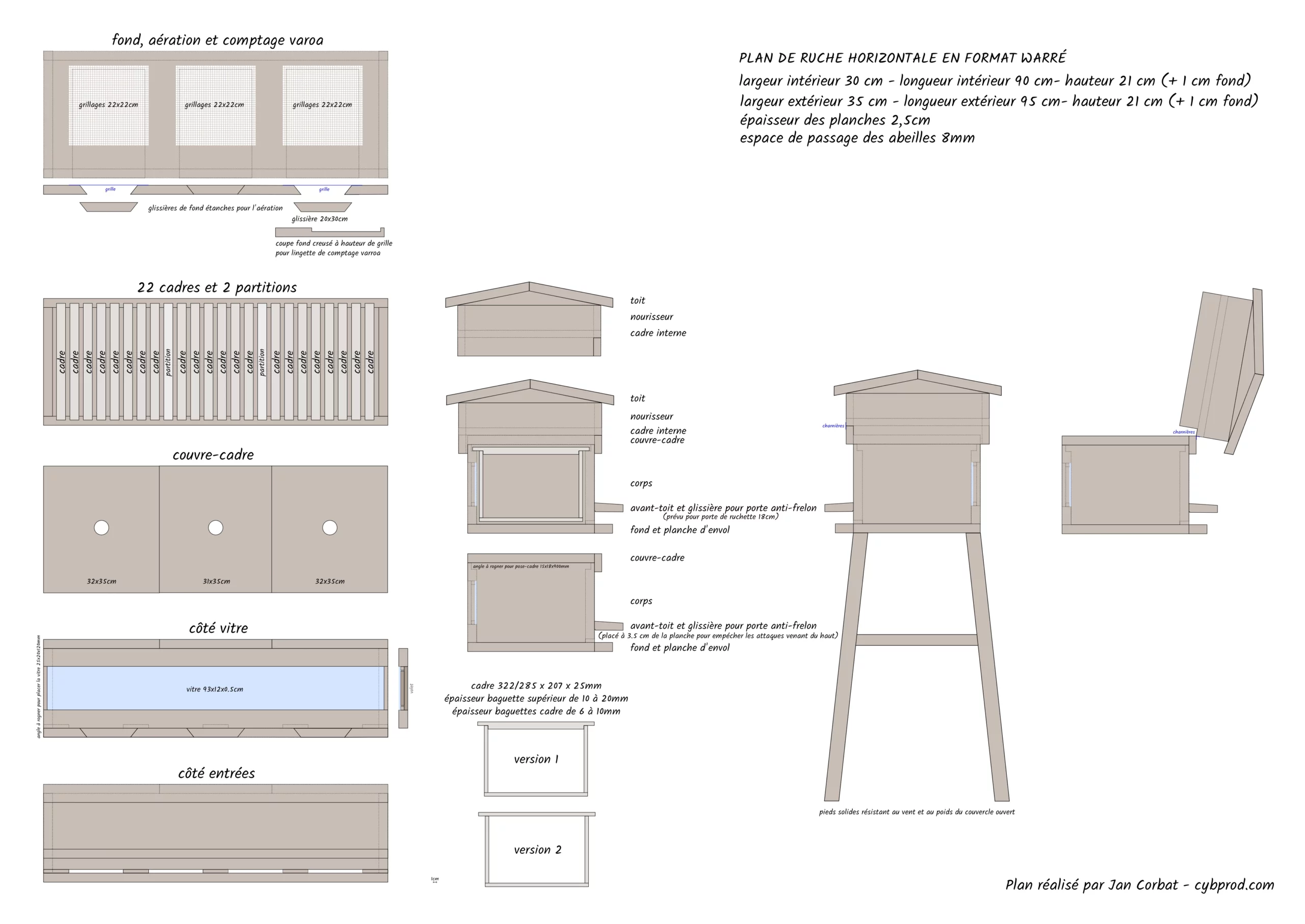 Si d’aventure un menuisier ou une association de la région à le cœur de se lancer dans la construction de ce type de ruche, je me ferais un plaisir de l’accompagner pour plus d’explications. N’étant pas équipé pour couper une planche droite, je profiterais volontiers de l’occasion pour effectuer quelques découpes. Je récupère aussi des planches en bois massif pouvant servir à la construction, merci d’avance pour votre soutien. Le plan est disponible gratuitement ci-dessous pour un usage non-commercial uniquement, merci de respecter l’esprit de partage.